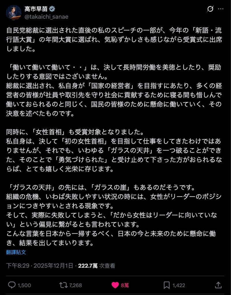 她獲獎的那句「働いて、働いて、働いて」(工作、工作、再工作),她明言這不是鼓勵社畜式的過勞,而是「國家經營者」本該有的自我擔當。